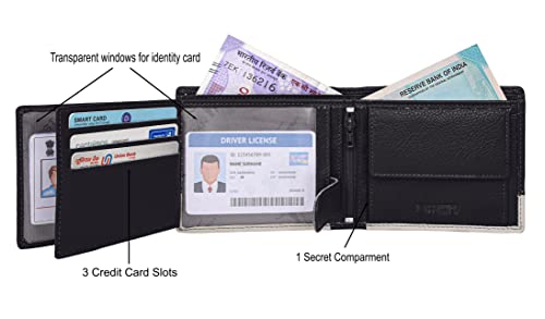- Special Feature: The wallet has 6 inbuilt card Slots, 2 currency Slots, 1 Secret Compartment, a Coin Pocket, 1 Zippered Section and 2 Transparent Windows for your Driver's License or work Id.